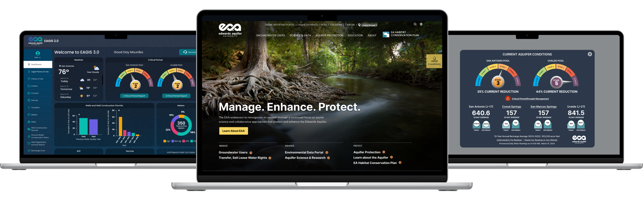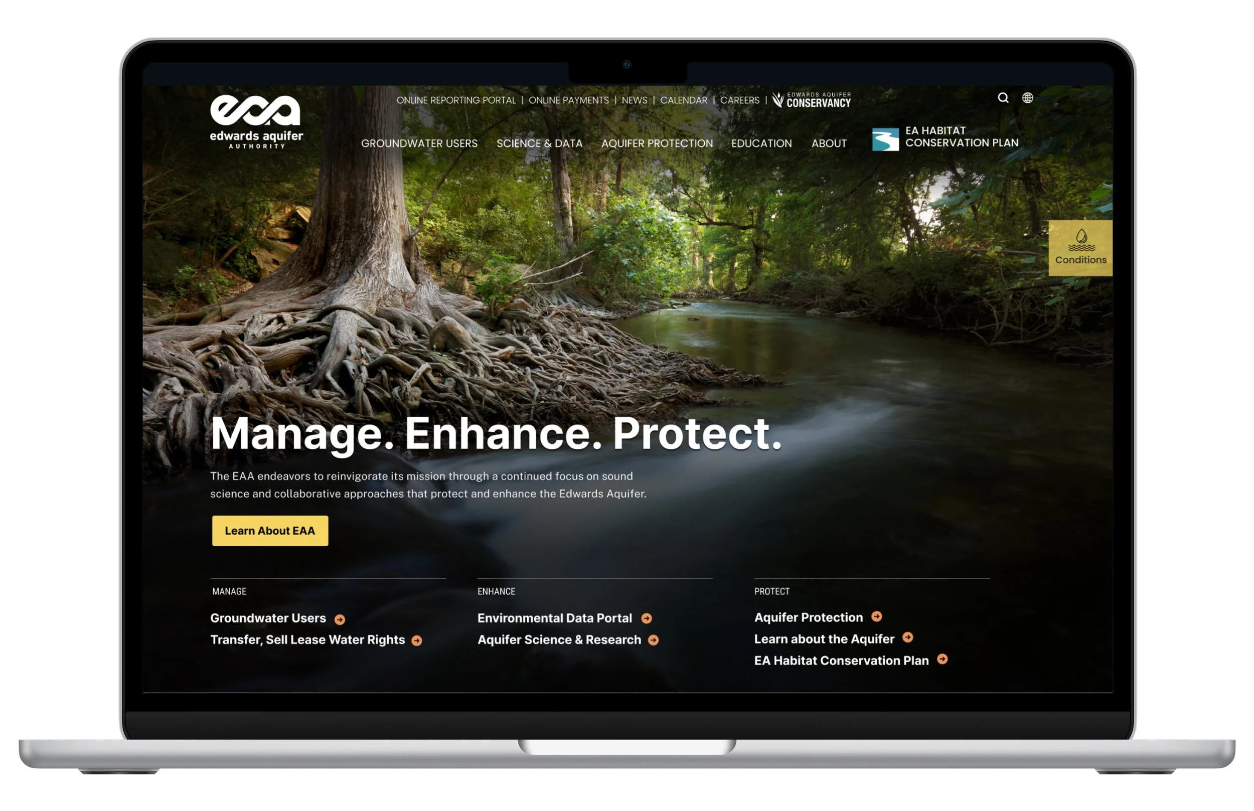 Homepage design for Edwards Aquifer Authority’s site highlighting the organization’s three focus areas: Manage, Enhance, Protect.