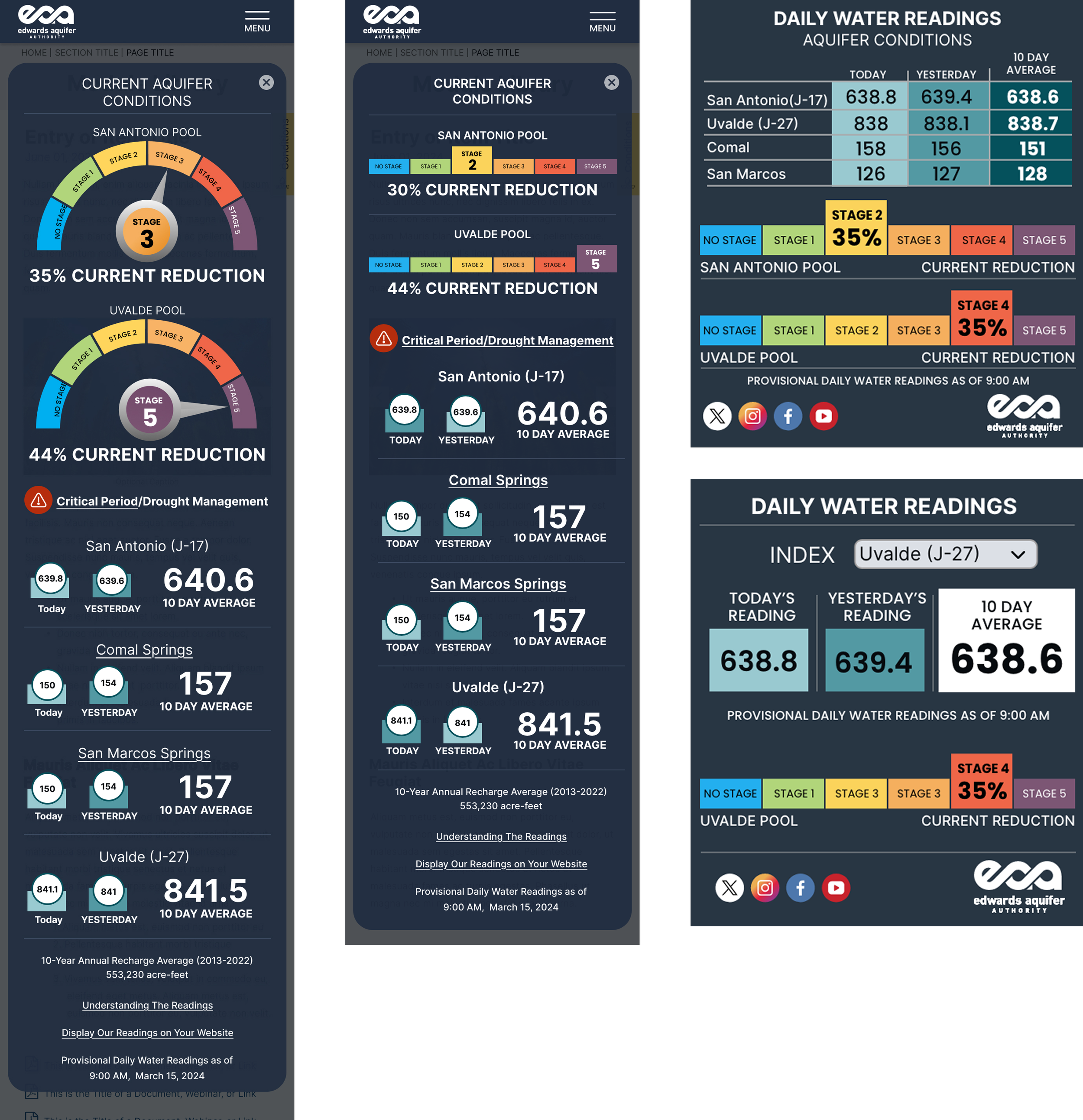 I focused on designing for the site's primary users—permit holders and groundwater users who needed quick access to tools and information. The drought gauges, for example, translated technical data into immediately useful visuals. Template designs prioritized clear layouts and easy navigation. I incorporated large photography and modern design elements where they didn't interfere with usability, but the core structure was built around how people actually used the site—checking drought conditions, accessing permits, and using calculators.