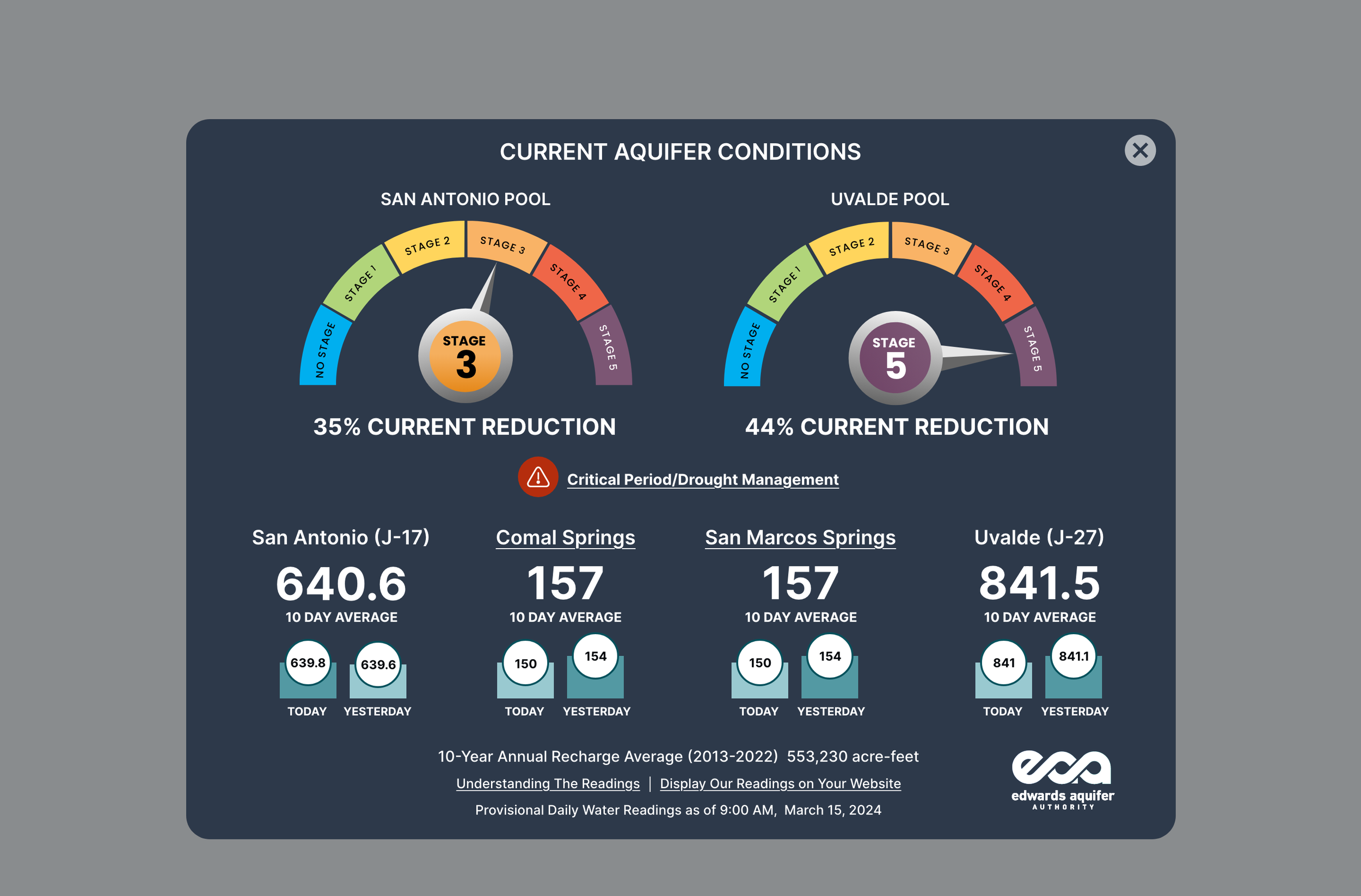 Permit holders checking drought conditions need immediate answers—whether they can irrigate depends on real-time aquifer levels. I designed a drought conditions gauge modal using color-coded visual indicators that translated complex scientific measurements into at-a-glance status updates. This allowed water users to make time-sensitive operational decisions without parsing technical data tables.